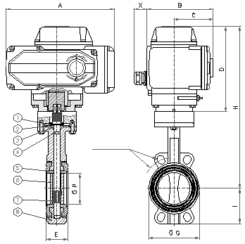 D971X-6/10/16對(duì)夾式電動(dòng)軟密封蝶閥主要外形連接尺寸 單位:mm